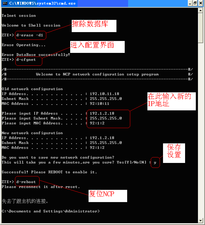 4.2.4: 待NCP重新工作起來后(出現(xiàn)Erase DataBase successfully!),輸入d-cfgnet,進(jìn)入登錄界面,依次輸入規(guī)劃好的網(wǎng)元IP地址、掩碼、MAC地址。